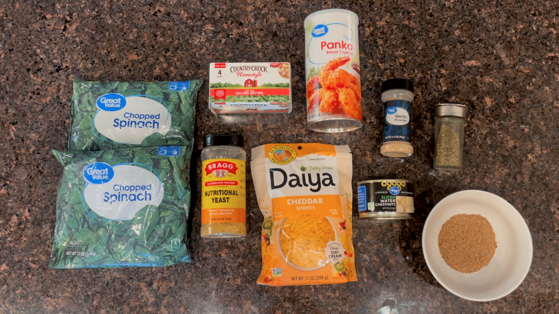 - In a large mixing bowl, combine all the ingredients: spinach, breadcrumbs, butter, Italian seasoning, garlic powder, water chestnuts, eggs, cheese, and salt.